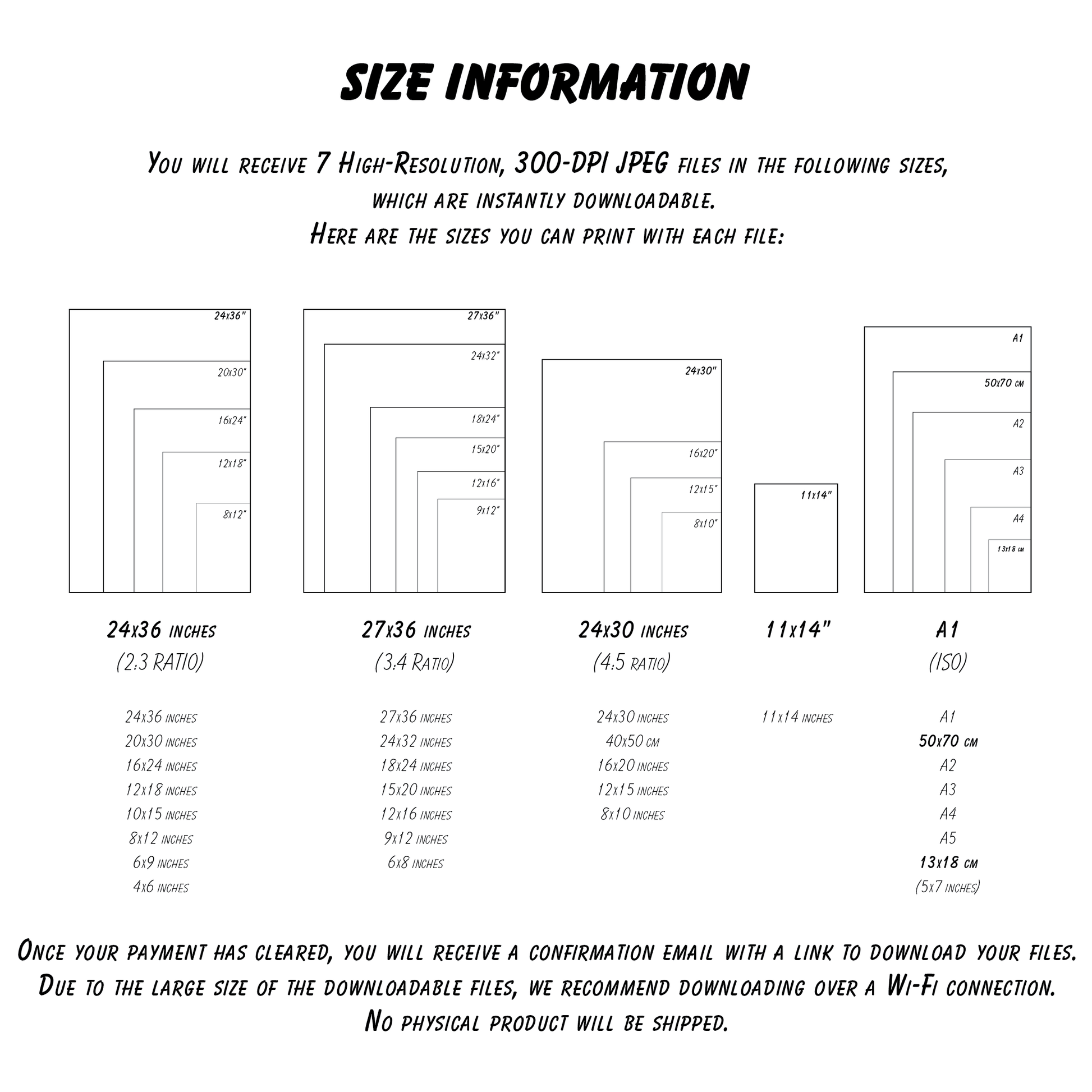 You will receive 7 High-Resolution, 300-DPI JPEG files in the following sizes, which are instantly downloadable.